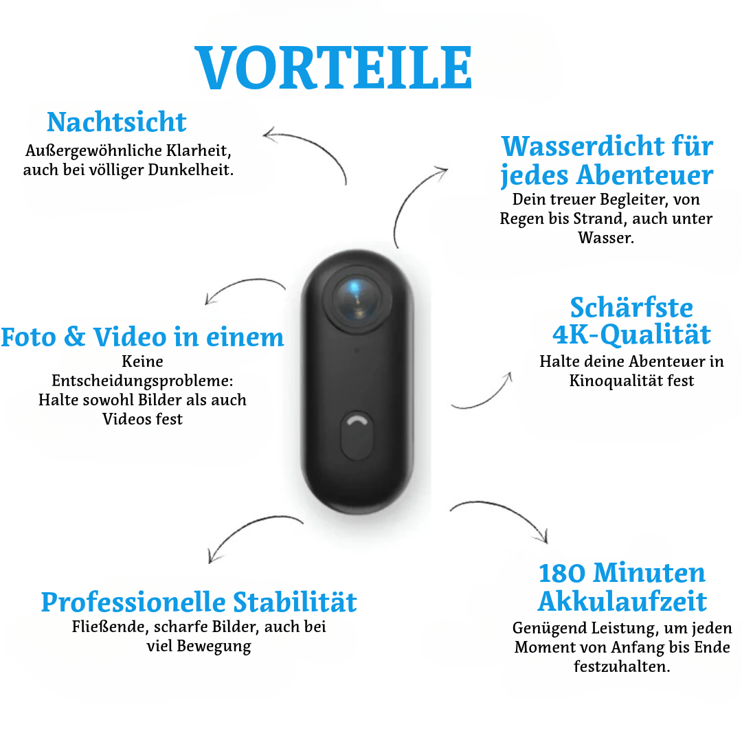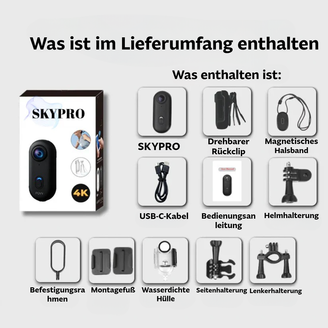 Möchtest du deine Abenteuer ohne Aufwand aufnehmen? Die SkyPro™ POV Kamera ist eine ultrakompakte, freihändige 4K-Kamera, die du direkt an deiner Brust, deinem Helm oder deiner Tasche befestigen kannst. Perfekt für Reisen, Sport oder Content-Erstellung und entworfen für alle, die Freiheit und Qualität in einem robusten Gerät vereinen möchten.